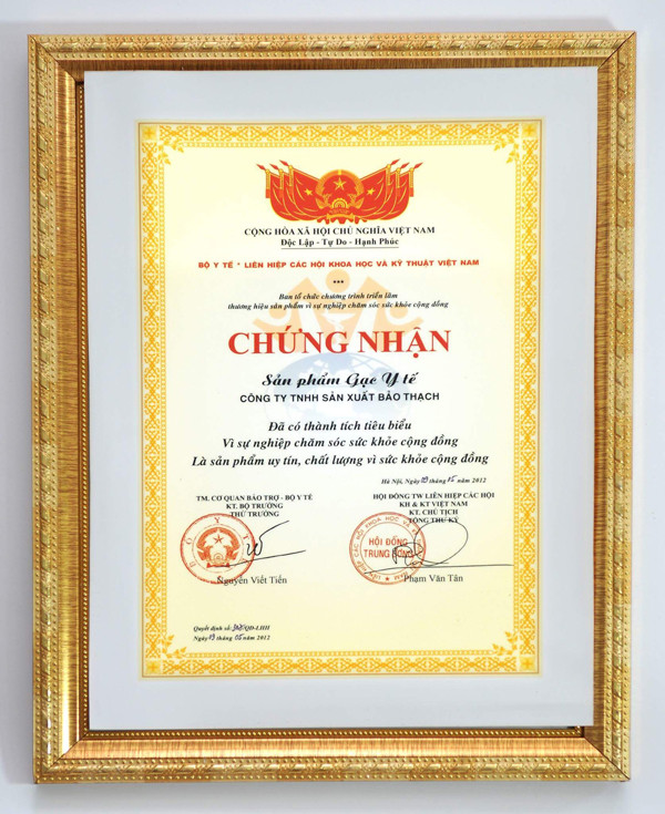 -Năm 2012 sàn phầm gạc y tế và bông y tế của Bảo Thạch được chứng nhận “đã có thành tích tiêu biểu vì sự nghiệp chăm sóc sức khỏe cộng đồng ,Là sàn phầm uy tín chất lượng vì sức khỏe cộng đồng năm 2012”