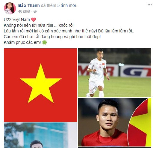 Diễn viên Bảo Thanh chia sẻ cô đã bật khóc khi U23 Việt Nam làm nên kì tích. “U23 Việt Nam. Không nói nên lời nữa rồi ... khóc rồi! Lâu lắm rồi mới lại có cảm xúc mạnh như thế này! Đã lâu lắm lắm rồi. Các em đã chơi rất đàng hoàng và ghi bàn thật đẹp! Khâm phục các em”- Bảo Thanh nghẹn ngào.