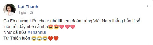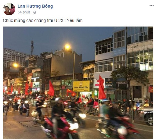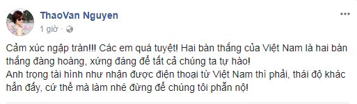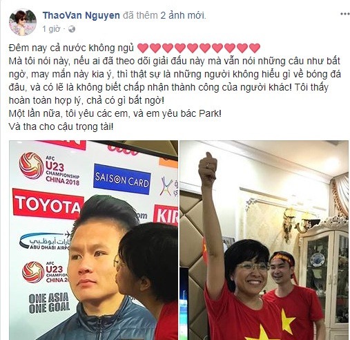Cô viết: “Đêm nay cả nước không ngủ. Mà tôi nói này, nếu ai đã theo dõi giải đấu này mà vẫn nói những câu như bất ngờ, may mắn này kia ý, thì thật sự là những người không hiểu gì về bóng đá đâu, và có lẽ là không biết chấp nhận thành công của người khác! Tôi thấy hoàn toàn hợp lý, chả có gì bất ngờ! Một lần nữa, tôi yêu các em, và em yêu bác Park! Và tha cho cậu trọng tài!”.