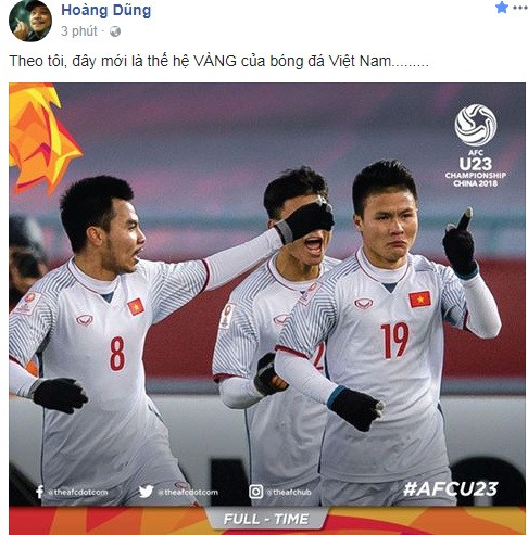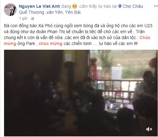Có vẻ như diễn viên Việt Anh không có mặt ở Hà Nội để theo dõi trận đấu của U23 Việt Nam. Trên trang cá nhân, anh viết: “Bà con đồng bào Xa Phó cùng ngồi xem bóng đá và ủng hộ cho các em U23 và đúng như dự đoán Phan Thị sẽ chuẩn bị tiệc để chờ các em về. Trận chung kết không còn là vấn đề nữa, các em đã đi vào lịch sử của dân tộc. Chúc mừng ông Park, chúc mừng các chiến binh .... tự hào về các em”.