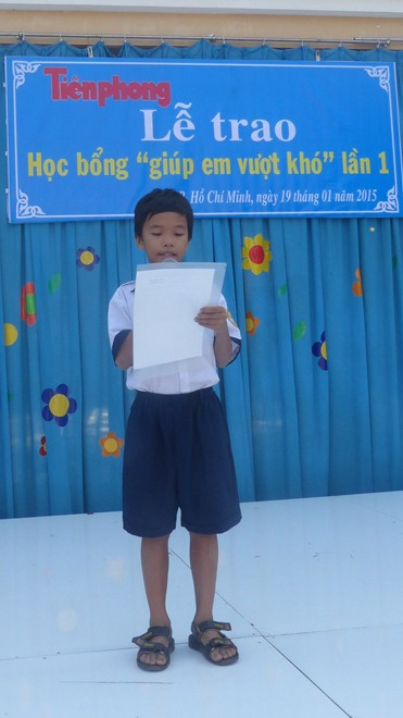 Thay mặt những học sinh nhận học bổng, em Trương Minh Khôi, học sinh lớp 4.4 cho biết: “Dù hoàn cảnh gia đình khó khăn, nhưng chúng em vẫn mong muốn được học tập tốt để vươn lên và giúp đỡ gia đình. Học bổng của báo Tiền Phong sẽ giúp em có thêm động lực để thực hiện mong ước này. Em xin cảm ơn báo Tiền Phong đã quan tâm, giúp đỡ chúng em”.