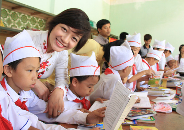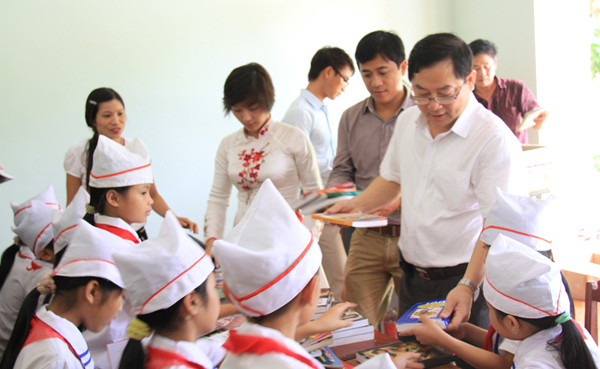 | Phóng viên báo Tiền Phong tặng sách cho các cháu nhỏ. Ảnh: Trường Phong. |