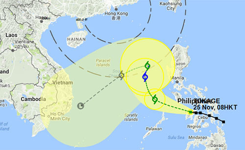 Ngày 26/11, bão sẽ cách đảo Song Tử Tây (thuộc quần đảo Trường Sa) khoảng 500 km phía đông đông bắc, với cường độ gió 90 km/h, tăng thêm một cấp.