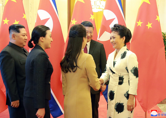 Đệ nhất phu nhân Ri Sol-ju của Triều Tiên bắt tay Đệ nhất phu nhân Bành Lệ Viện của Trung Quốc. Ảnh: Rodong Sinmun