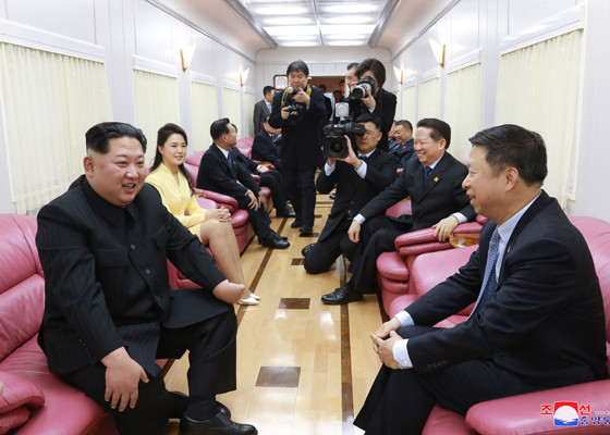 Được biết, ông Kim Jong-un và phu nhân Ri Sol-ju di chuyển từ Triều Tiên đến Bắc Kinh (Trung Quốc) bằng tàu hoả. Đây cũng chính là đoàn tàu từng đưa cố Chủ tịch Triều Tiên Kim Jong-il đến thăm nước láng giềng. Ảnh: Rodong Sinmun