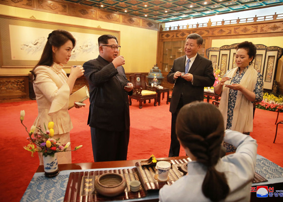 Chủ tịch Kim và phu nhân được Chủ tịch Tập giới thiệu về văn hóa Trung Quốc. Ảnh: Rodong Sinmun