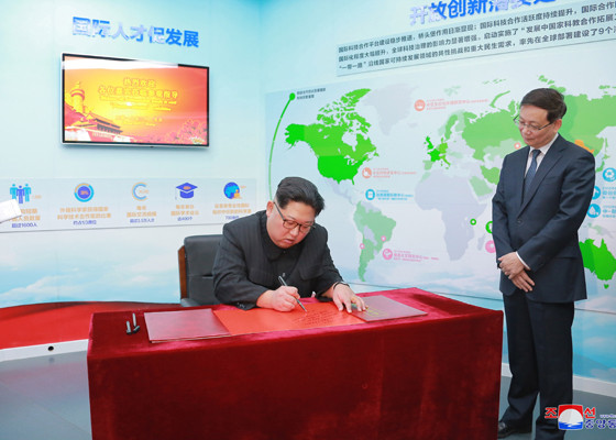 Chủ tịch Kim chăm chú nghe giới thiệu về các thành tựu khoa học của Trung Quốc. Ảnh: Rodong Sinmun
