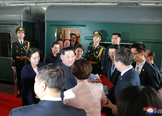 Các quan chức Trung Quốc đón tiếp nhà lãnh đạo Triều Tiên. Ảnh: Rodong Sinmun