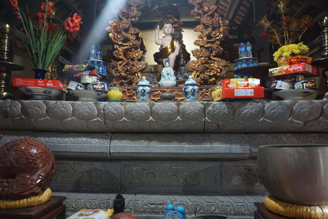 | Ở một góc của hương án có khắc dòng chữ Hán "Thuận thiên ngũ niên, Nhâm tý niên .... ". Qua dòng chữ này, xác định được hương án được tạo ra từ năm Nhâm tý 1432, niên hiệu Thuận Thiên thứ 5 thời vua Lê Thái Tổ. Người tạo hương án và cung tiến vào chùa là ông Lưu Khụ, vợ là Đỗ Xú người Khám Lạng. |
