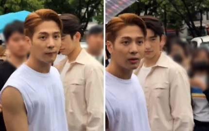 Xem clip có thể thấy một bạn fan nữ che ô cho Jackson vì trời mưa. Tuy Jackson có ý từ chối nhưng bạn fan nữ vẫn tiếp tục che ô cho anh chàng. Sau đó, có một người đàn ông xô bạn fan nữ này một cái rất mạnh. Ngay lập tức, sắc mặt của Jackson liền thay đổi. Anh chàng thực sự tức giận, ánh mắt tóe lửa nhìn người đàn ông kia và bảo: "Anh đừng có xô đẩy con gái như thế!".