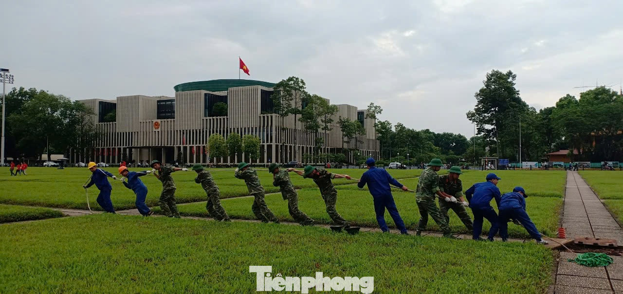 | Cán bộ, chiến sĩ, nhân viên Bộ Tư lệnh Bảo vệ Lăng Chủ tịch Hồ Chí Minh bảo dưỡng các thiết bị tại Quảng trường Ba Đình. |