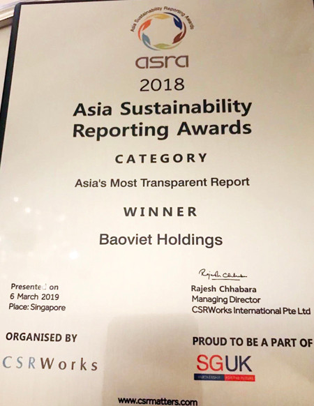 Ngày 6/3/2019, tại Singapore, Tập đoàn Bảo Việt đã được vinh danh trong Lễ công bố và trao giải Báo cáo phát triển bền vững minh bạch nhất Châu Á (ASRA) 2018 do tổ chức hàng đầu về cung cấp dịch vụ, tư vấn và đào tạo thực hành phát triển bền vững CSRWorks (CSRWorks International) tổ chức thường niên.