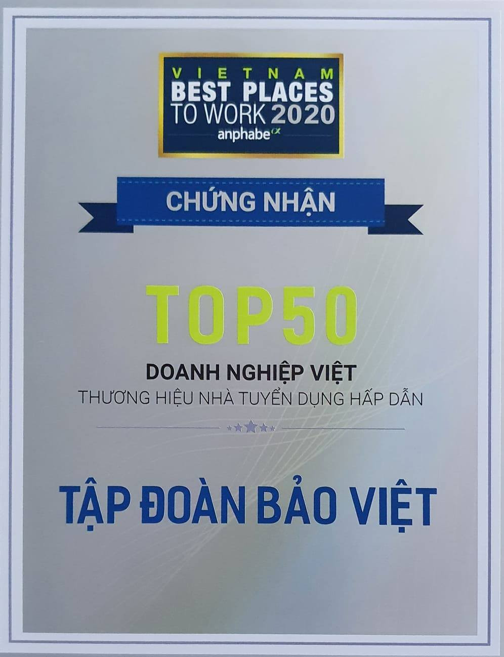 Ở hạng mục đánh giá các đơn vị bảo hiểm, Tập đoàn Bảo Việt là đơn vị duy nhất hoạt động ở cả 2 lĩnh vực bảo hiểm nhân thọ và bảo hiểm phi nhân thọ được vinh danh trong Top 100 “Nơi làm việc tốt nhất Việt Nam” và Top 50 “Thương hiệu nhà tuyển dụng hấp dẫn” năm 2020. Công ty Chứng khoán Bảo Việt - đơn vị thành viên của Tập đoàn Bảo Việt cũng được vinh danh Top 50 “Thương hiệu nhà tuyển dụng hấp dẫn” năm 2020.