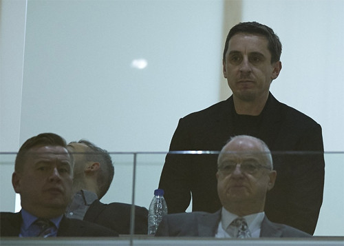 HLV Valencia, Gary Neville quan sát trận đấu từ khán đài.