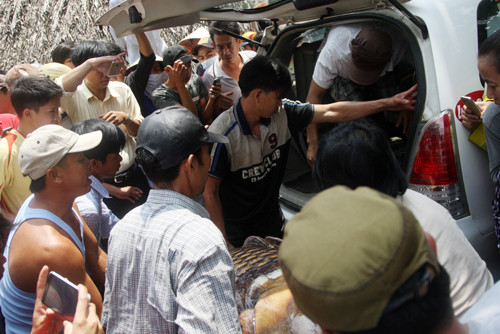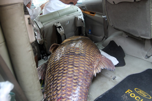 Sau đó chú cá hô được bỏ lên xe taxi đưa đi trong vòng vây của hàng trăm người hiếu kỳ.