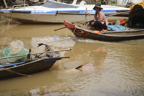 Cá hô dài khoảng 1,5 m, ngang hơn 0,5m. "Lúc đầu tôi không biết là loài cá gì. Nhưng khi vào bờ nhiều người cho biết đây là cá hô, rất quý hiếm và bán giá rất cao", anh Dũng nói. Đến 12h, anh Dũng quyết định bán con cá này cho một thương lái ở Thủ Đức với giá 1,5 triệu đồng/kg. Chú cá được 5-6 người khiêng lên bờ.