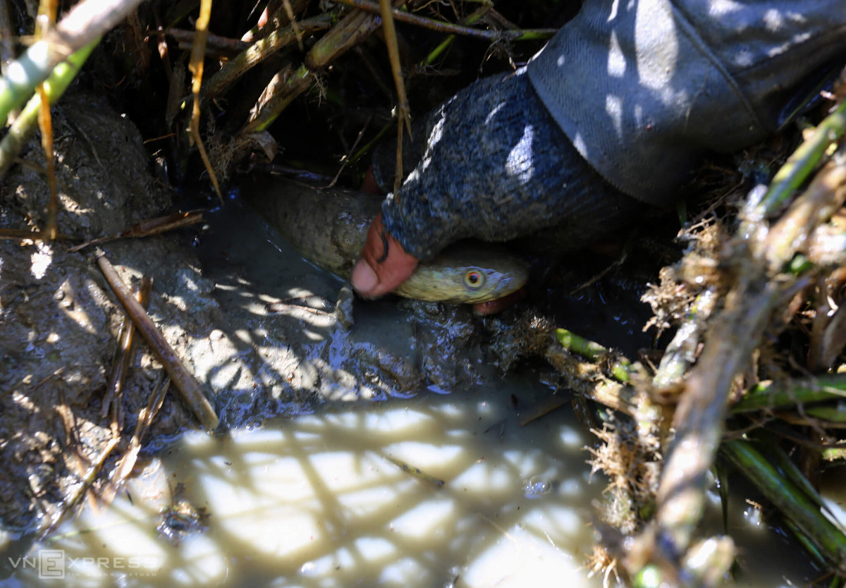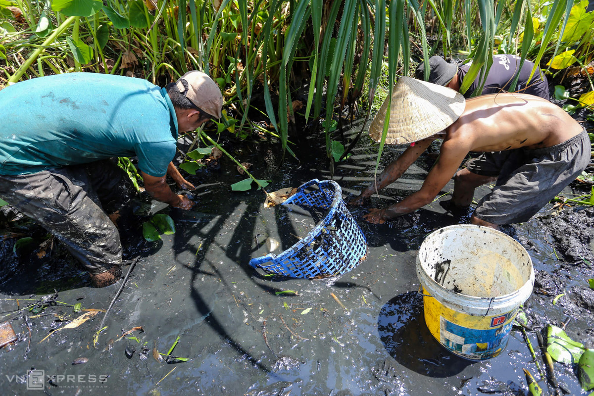 Khi đoạn kênh vừa cạn nước và thông thoáng, cả ba người cùng sục tay xuống lớp bùn để dò bắt cá. "Khi bắt phải rất cẩn thận để tránh va phải vật sắc nhọn", anh Hoàng nói.