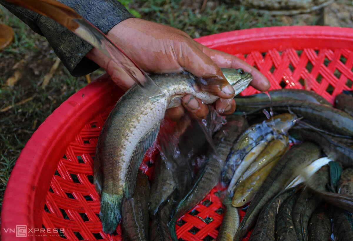 Cá bắt được chủ yếu là tràu, trê, rô đồng, rô phi... được rửa sạch bùn đất và cho vào rổ đựng.