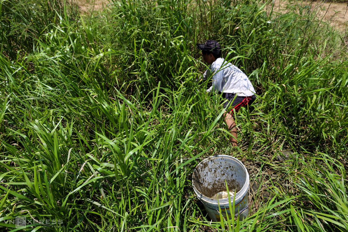Đặt chiếc thùng nhựa trên bàu nước đã cạn, một nông dân cúi rạp mình trong đám cỏ rậm để tìm bắt cá.