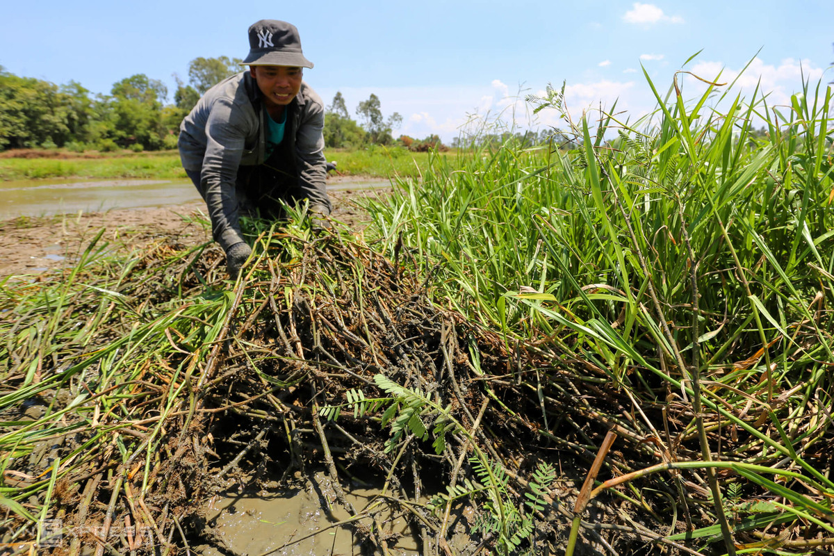 "Cá tràu, rô đồng thường trú ẩn trong cỏ rậm, không chịu ra ngoài", anh Võ Đình Giang (xã Tam Đàn) nói và dùng tay giật mạnh thảm cỏ, để lộ lớp bùn đất.