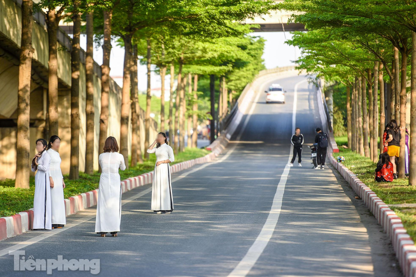 | Gần đây, hàng cây bàng lá nhỏ tại khu vực nút giao cầu Thanh Trì và Quốc lộ 5 cũ (huyện Gia Lâm, Hà Nội) chuyển sang màu xanh non tạo nên khung cảnh lãng mạn đang thu hút nhiều người tới chụp ảnh. |
