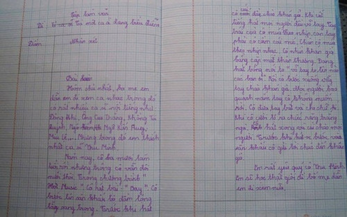 Mở đầu bài tập làm văn, học sinh này thừa nhận yêu nhất ca sĩ Thu Minh trong số các ca sĩ Đông Nhi, Miu Lê, Ngô Kiến Huy… “Cô ba mươi lăm tuổi rồi nhưng trông cô vẫn đôi mươi thôi... Cô bước lên sân khấu bộ đầm lộng lẫy sang trọng. Trước khi hát cô cúi đầu chào khán giả. Khi cất tiếng hát mọi người đều vỗ tay. Tay trái của cô múa theo nhịp, còn tay phải cô cầm cái míc. Chân cô múa theo nhịp nhạc”.