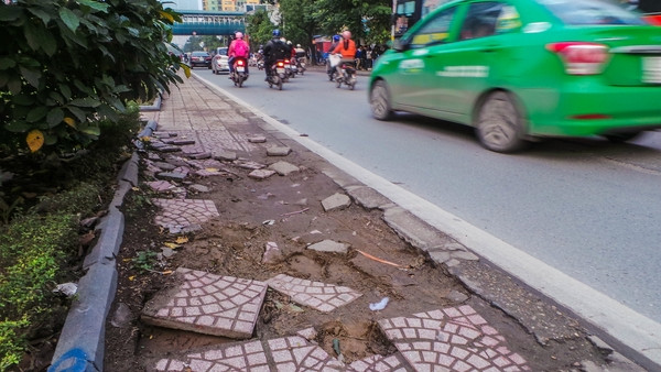Gạch trên dải phân cách cũ bị cày nát, nhiều chỗ bị vỡ vụn mất cảnh quan.