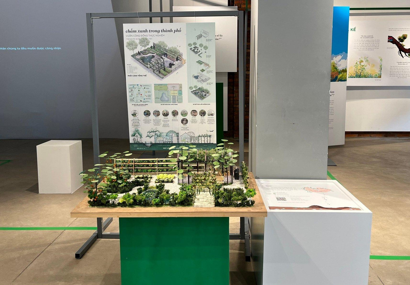 Mỗi góc của triển lãm đều có những câu chuyện đầy thú vị xung quanh quanh các bạn trẻ đang tập sống xanh, hòa mình với thiên nhiên, trân trọng và nâng niu không gian sống của mình. Triển lãm còn đưa ra một số ý tưởng độc đáo nhằm tiến tới xây dựng một không gian xanh ở chính nơi mình sống. Trong đó đặc biệt nhất là mô hình “Chấm xanh trong thành phố”. Đây là “Vườn cộng đồng thực nghiệm” do hai kiến trúc sư Hà Như và Ngọc Trâm thiết kế. Mô hình đưa ra một giải pháp tích hợp nhiều khu vực khác nhau trên cùng một khu vườn như: vườn đa tầng, hồ sinh thái, luống rau, vườn ươm - workshop, vườn đứng... tạo ra một không gian xanh vô cùng độc đáo.