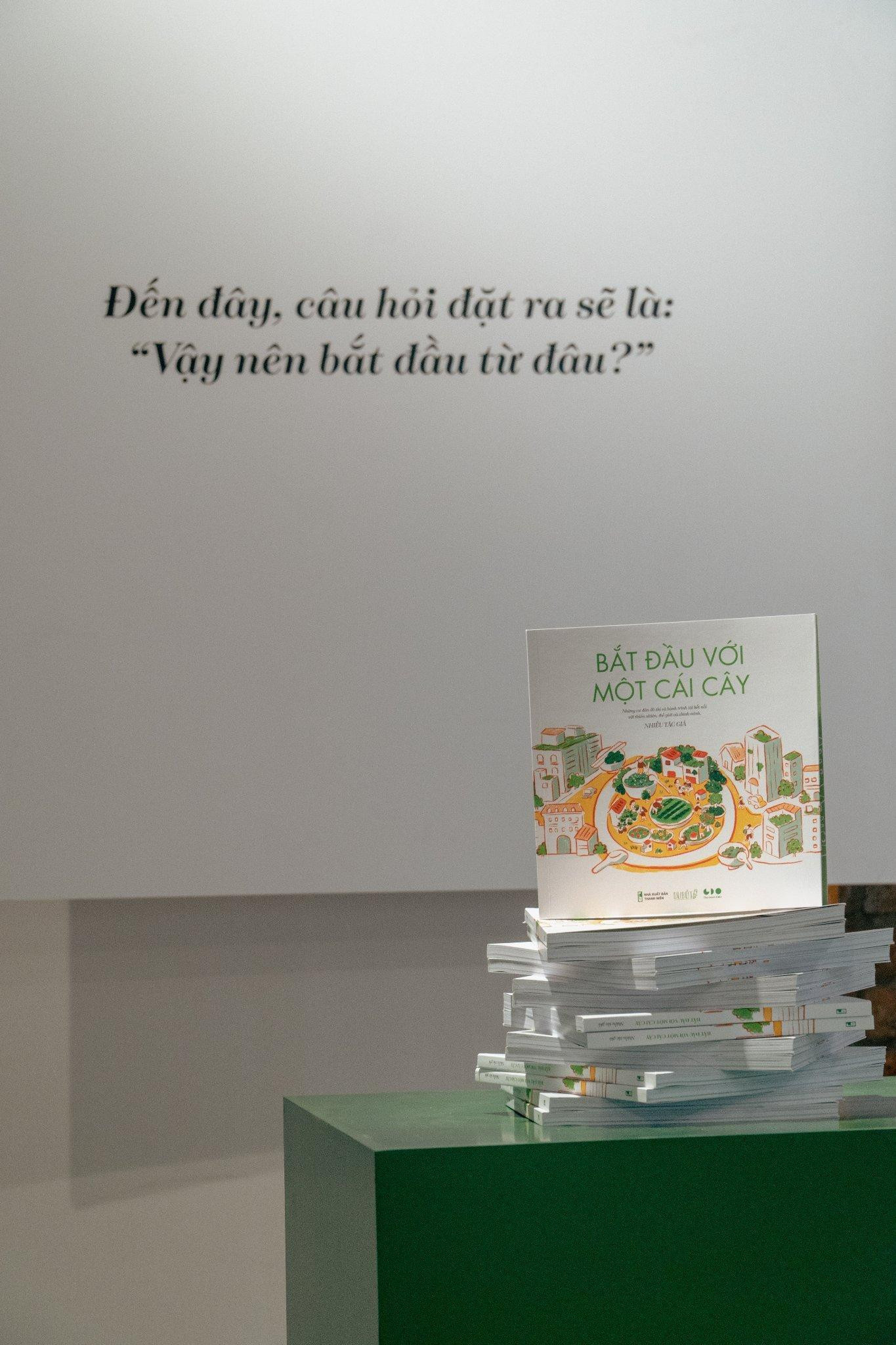 “Bắt đầu với một cái cây” là một không gian mở tạo điều kiện cho mọi người tận hưởng một khoảng xanh ngay trong lòng thành phố. Trung tâm chính là cuốn sách mà The Green Dots ấp ủ: “Bắt đầu với một cái cây”. Thông qua cuốn sách, hành trình của những người trẻ bận rộn mà quên mất không gian xanh là nơi hoàn hảo để giảm bớt áp lực. Cuốn sách còn đưa ra các kiến thức cơ bản để tạo ra khu vườn xanh cho riêng mình. "Những việc nhỏ như trồng cây trước ban công, để một cái cây nhỏ lên bàn học chắc chắn sẽ lan tỏa những điều tích cực đến cho mọi người. Bởi lẽ nhờ những điều nhỏ ấy mà một không gian xanh chúng ta từng ao ước được tạo nên", Thanh Ngọc - một bạn trẻ tham dự triển lãm chia sẻ.