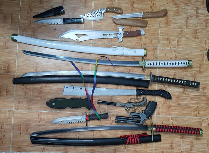 Tiến hành khám xét nơi ở của Hòa, lực lượng chức năng tiếp tục thu giữ 7 bịch ma túy đá; 1 bịch Ketamine; 38 viên thuốc lắc; 1 chai nhựa chứa nước đã pha ma túy đá; 1 cục bột màu trắng; 1 súng bật lửa, 1 súng mô hình; 10 cây dao, đao, kiếm các loại và gần 27 triệu đồng tiền mặt.