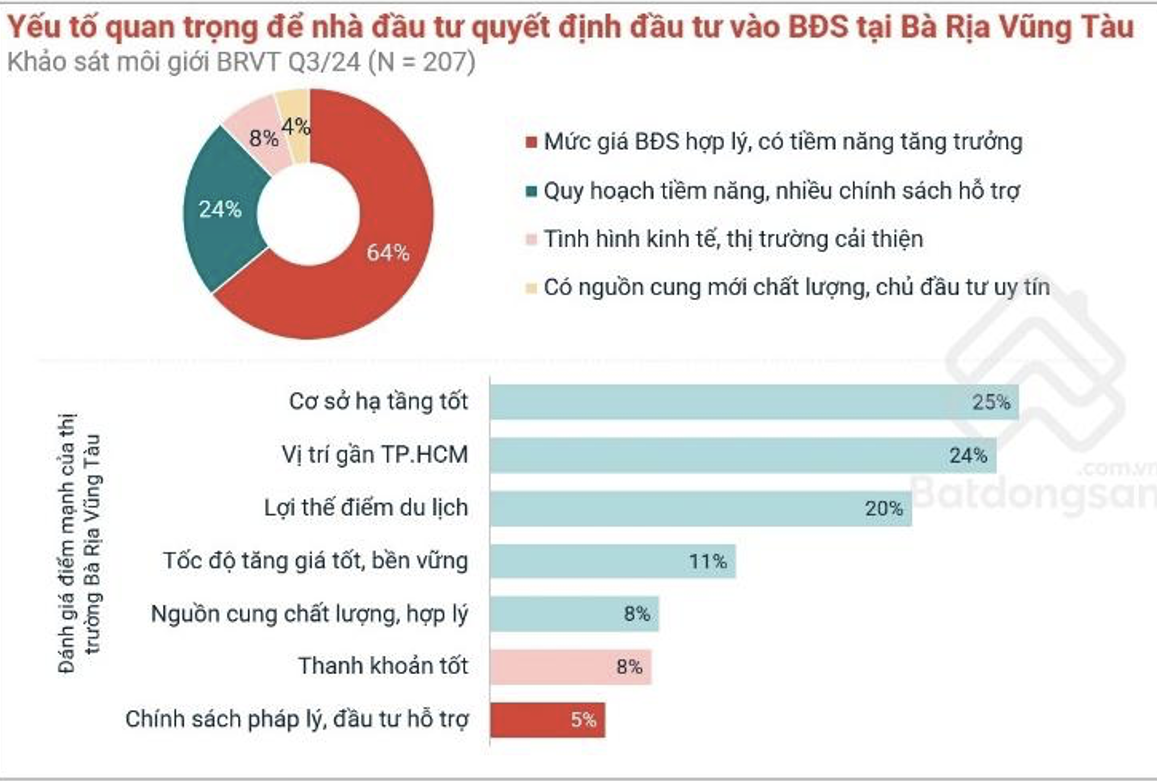 Khảo sát của Batdongsan.com.vn về yếu tố quan trọng để nhà đầu tư quyết định đầu tư vào bất động sản tại Bà Rịa - Vũng Tàu cũng cho thấy, 64% môi giới cho rằng mức giá tại đây hợp lý và có tiềm năng tăng trưởng; 24% nhận định quy hoạch tiềm năng, nhiều chính sách hỗ trợ.