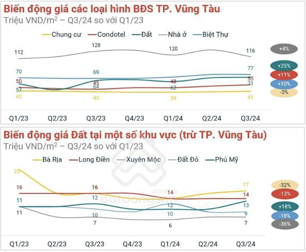 Theo dữ liệu của Batdongsan.com.vn, giá rao bán các loại hình tại Bà Rịa - Vũng Tàu vào tháng 9/2024 so với tháng 1/2024 biến động mạnh. Cụ thể, giá đất tăng 36%, condotel tăng 15%, biệt thự và chung cư đều tăng 6%, nhà riêng giảm 6%.