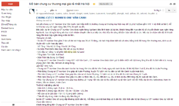 Anh Thảo cho hay, gần đây nhất anh nhận được những email có nội dung dài lê thê để giới thiệu bán dự án chung cư ở Hà Nội, thậm chí là cả dự án rao bán đất ở Bình Dương, rao bán nhà ở Sài Gòn…