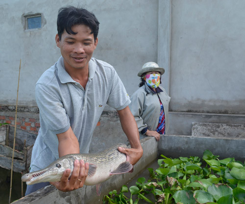 Trưa 8.11, chị Phượng phát hiện trong cái bẫy do gia đình chị đặt dưới con sông nhỏ trước nhà có cá quẫy. “Nhìn nước bị quẫy mạnh tôi biết là cá to lắm, dỡ lên thì hoảng hồn. Trông nó như cá sấu mà không có chân. Sau đó, tôi gọi người thân trong gia đình đưa cá lên bờ và bỏ vào hồ nuôi”, chị Phương kể.