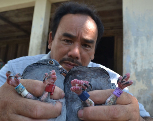 Điều đáng nói ở chỗ đôi chân chim đeo kiềng bằng 4 vòng nhựa dẻo gồm 4 màu sắc khác nhau, được đánh thông số “lạ”, bên trong còn có các mảnh giấy nhỏ với nhiều ký tự; phía dưới hai đôi cánh của cặp chim bồ câu này còn có các ký tự “lạ” màu xanh, đỏ.