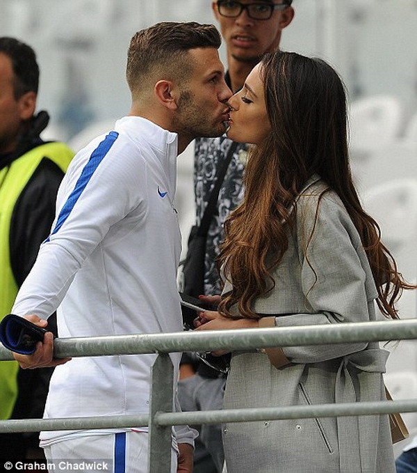 Cầu thủ điển trai Jack Wilshere nồng nhiệt bày tỏ tình cảm với vị hôn thê trên khán đài. Trước trận đấu, cầu thủ này suýt bị kỷ luật vì tội "trốn trại" dắt người thương đi lang thang phố thị Chantilly, Pháp suốt buổi chiều.