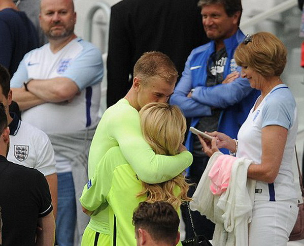 Sau trận đấu, thủ môn Joe Hart "vượt rào" lên khán đài ôm vợ của mình là Kimberly.
