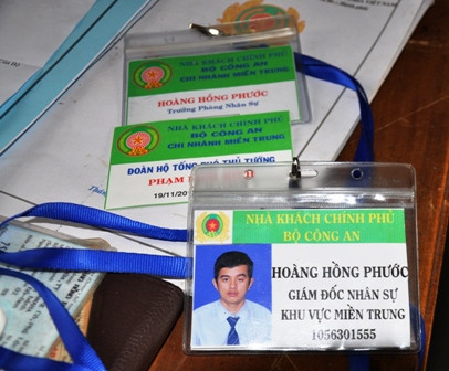 Ngoài ra, công an còn phát hiện trong hành lý của Phước mang theo có nhiều hóa đơn, vé máy bay và các giấy tờ như: Thẻ Giám đốc nhân sự, thẻ Trưởng phòng nhân sự, Thẻ đoàn hộ tống phó thủ tướng, Lý lịch viên chức, Thẻ Viên chức của người xin việc… thuộc Khu Nghỉ dưỡng Lăng Cô - Bộ Công an. Và có cả tất chân, cà vạt của công an.