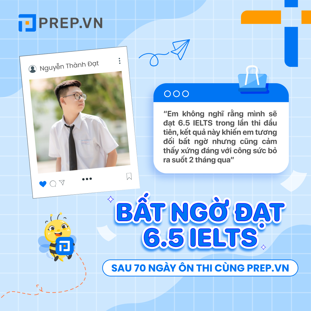 Nhờ sự quyết tâm và chăm chỉ, sau 2 tháng ôn thi cùng PREP, Thành Đạt đã “hái được quả ngọt” với con số 6.5 overall, khả năng sử dụng tiếng Anh đã tốt hơn hẳn lúc mới bắt đầu khóa học. “Em thích khóa học online tại PREP vì nó tiện cho em nhiều, em có thể chủ động được thời gian mình muốn học và có thể học ở bất cứ đâu. Lộ trình học chi tiết giúp em tiết kiệm thời gian và cân bằng với các hoạt động cá nhân khác”.