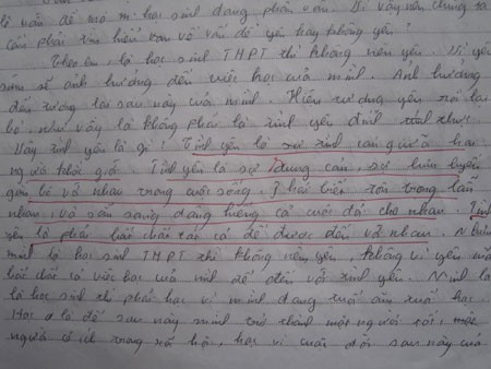 Rất may, phần lớn học trò của tôi cho rằng không nên yêu khi còn là học sinh THPT. Các em đều nhìn nhận được hậu quả của việc yêu sớm và câu trả lời được các em lí giải rất cặn kẽ ở nhiều góc độ.