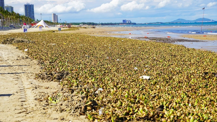Hiện tượng này xuất hiện rải rác từ đầu tháng 5 nhưng cao điểm là trong những ngày gần đây khi triều cường và dòng chảy ven bờ thay đổi mạnh. Hàng tấn lục bình từ các con sông bị cuốn trôi ra biển, kết hợp cùng rác thải sinh hoạt đã tấp vào bờ biển tạo nên khung cảnh nhếch nhác, gây mất mỹ quan nghiêm trọng.