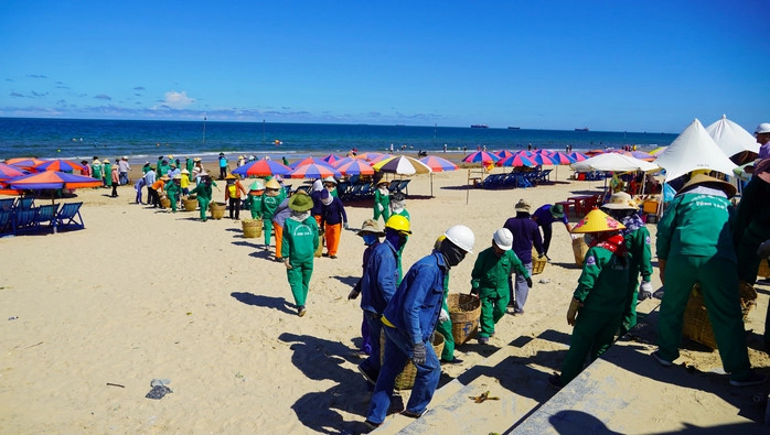 Trước thực trạng này, lực lượng công nhân môi trường cùng đội quản lý bãi biển đã phải liên tục thu gom, dọn dẹp từ sáng sớm đến chiều tối. Tuy nhiên, khối lượng rác phát sinh quá lớn khiến việc xử lý gặp nhiều khó khăn.