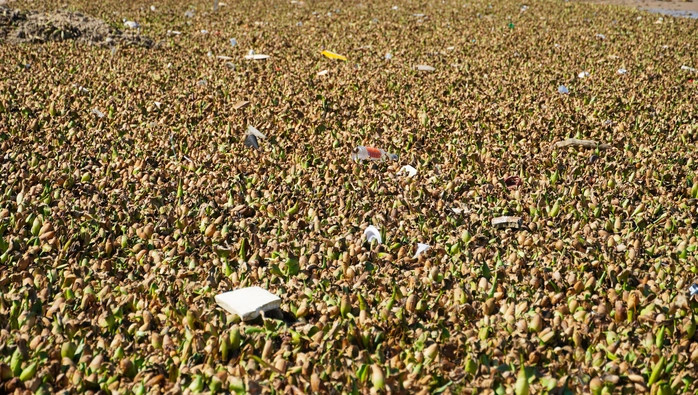 | Biển Bãi Sau tràn ngập lục bình và rác thải sinh hoạt từ đại dương tấp vào. |