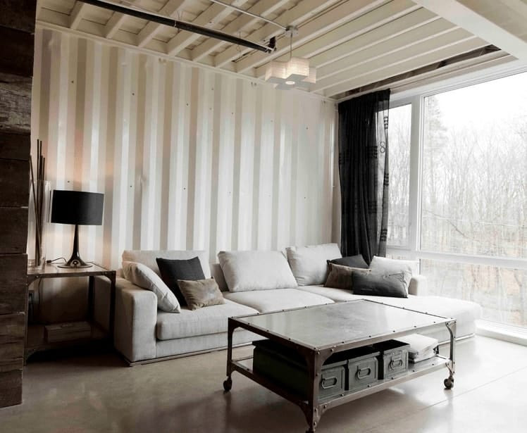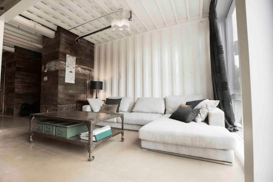 Phòng khách với tường và trần để nguyên bản là chiếc container cũ