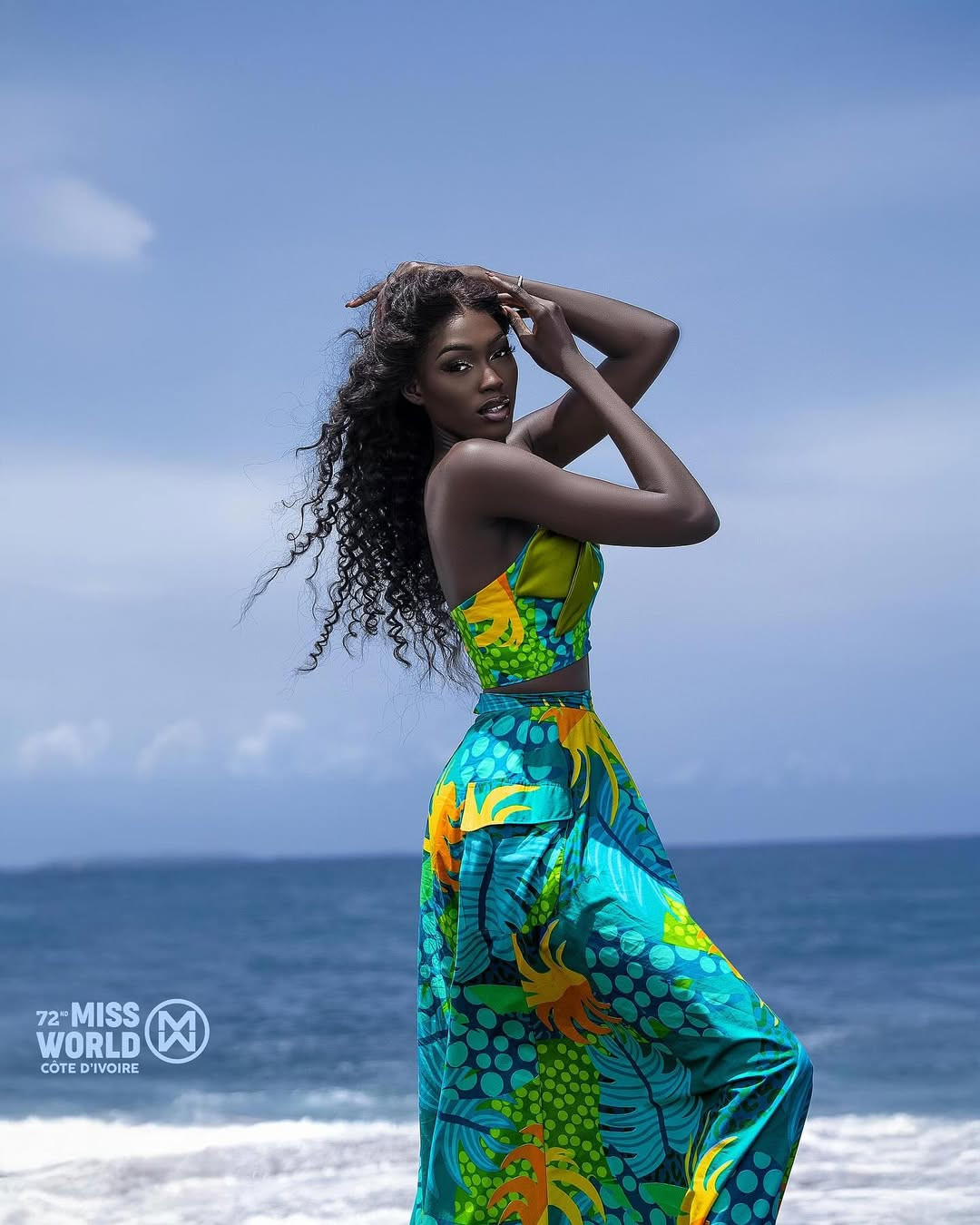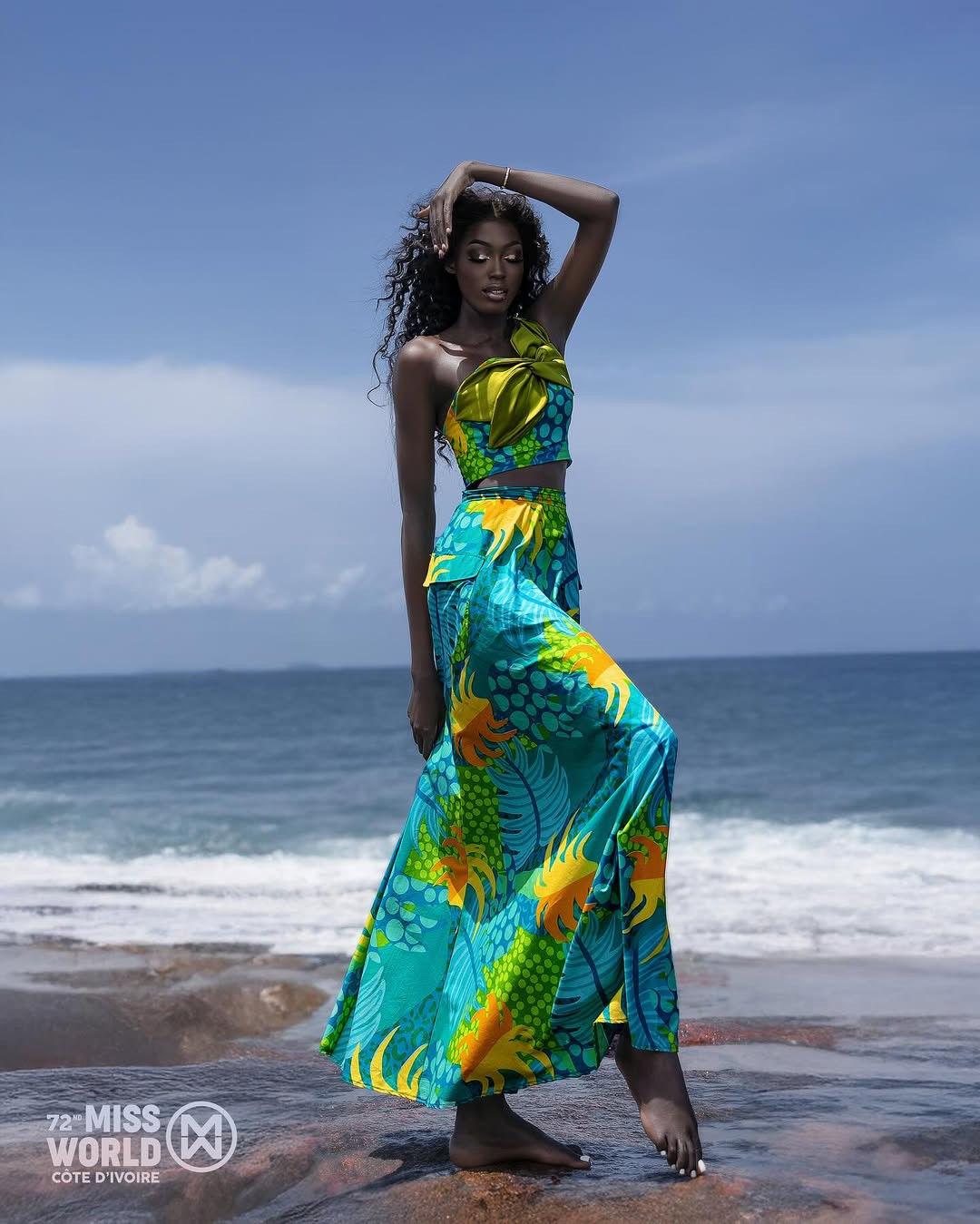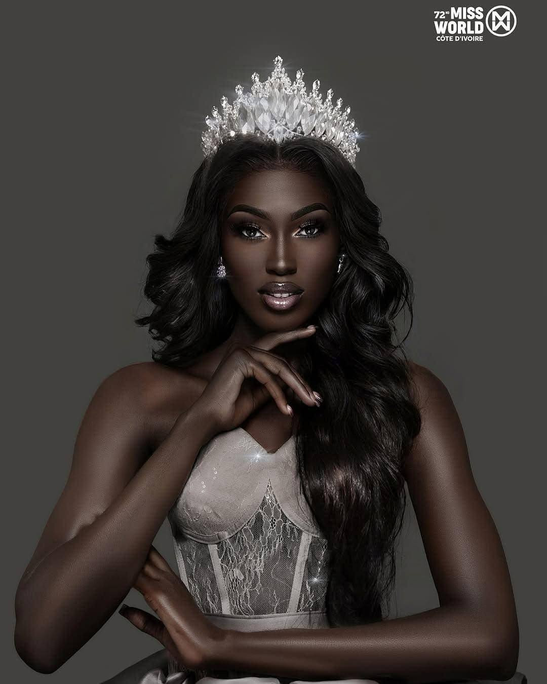 Trước khi Miss World 2025 chính thức bắt đầu, khán giả Việt đã đặc biệt chú ý đến đại diện Bờ Biển Ngà sau khi nhìn thấy bộ ảnh chân dung của cô. Nàng hậu mặc váy trắng đội vương miện pha lê lấp lánh tương phản với làn da màu sôcôla, tạo nên bức ảnh vô cùng độc đáo.