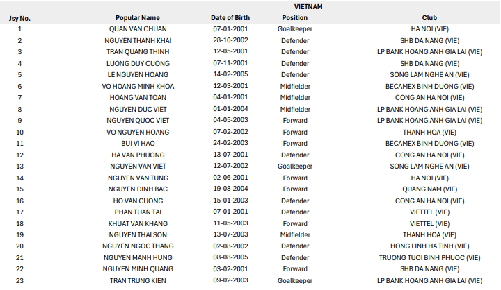 Danh sách số áo của U23 Việt Nam tại VCK U23 châu Á 2024