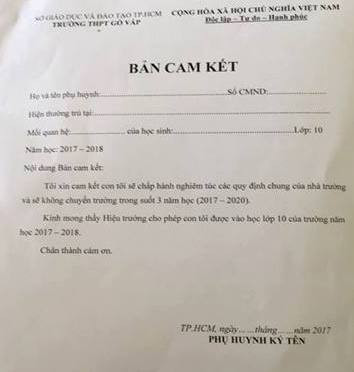 Cụ thể, khi phụ huynh đến đăng ký nhập học cho con ở trường THPT Gò Vấp thì được nhà trường đưa ra 1 bản cam kết với nội dung: “Tôi xin cam kết con tôi sẽ chấp hành nghiêm túc các nội quy của nhà trường và sẽ không cho con chuyển trường trong suốt 3 năm học (2017- 2020). Kính mong thầy Hiệu trường cho phép con tôi vào học lớp 10 của trường năm học 2017- 2018”.