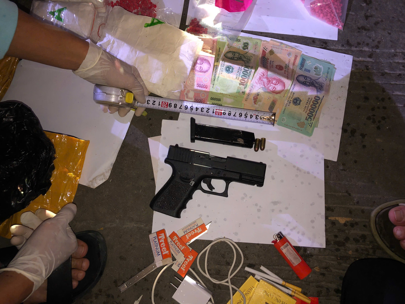 Qua khám xét, Công an huyện Đakrông đã phát hiện, thu giữ 12.019 viên ma túy tổng hợp và 1 khẩu súng quân dụng loại Glock FBI cùng 2 viên đạn được cất giấu trên người đối tượng Lê Huy Hoàng Q.