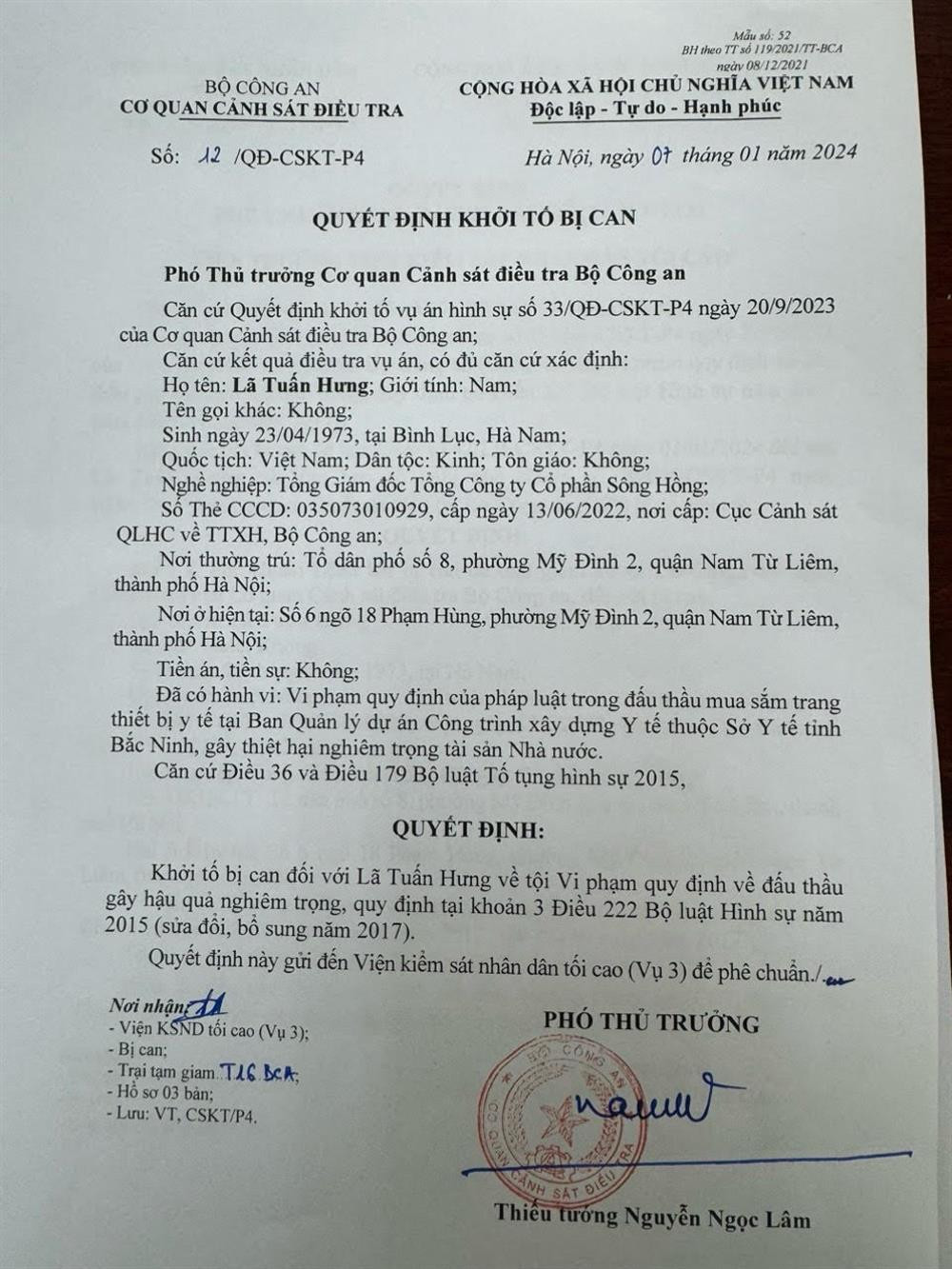 Cơ quan CSĐT Bộ Công an đã ra quyết định khởi tố bị can, bắt tạm giam và thi hành lệnh khám xét đối với Lã Tuấn Hưng, Tổng Giám đốc Tổng Công ty Cổ phần Sông Hồng, về tội “Vi phạm quy định về đấu thầu gây hậu quả nghiêm trọng”. Hiện Cơ quan CSĐT đang tiếp tục mở rộng điều tra vụ án, áp dụng các biện pháp để thu hồi triệt để tài sản cho Nhà nước.