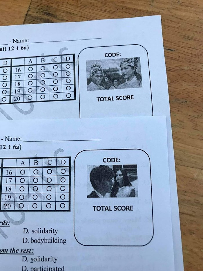 Cụ thể, thay vì sử dụng chữ cái hay mã số để làm mã đề theo cách trước đây mà nhiều người vẫn thường thấy, giáo viên này đã lựa chọn 2 hình ảnh vô cùng quen thuộc với giới trẻ hiện nay. Theo đó, giáo viên đã lựa chọn những hình ảnh trong MV ca nhạc “Em không sai, chúng ta sai” của Erik và “Không thể cùng nhau suốt kiếp” của nữ nghệ sĩ Hòa Minzy để phân biệt hai đề kiểm tra.